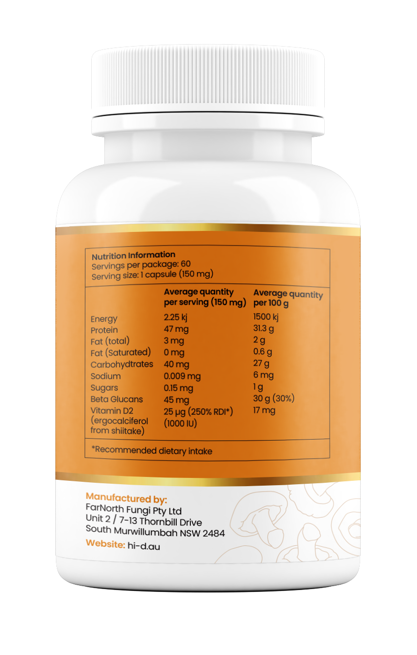 Hi-D is free from gluten, dairy, soy, fish, sugar, extracts, fillers or mycelium